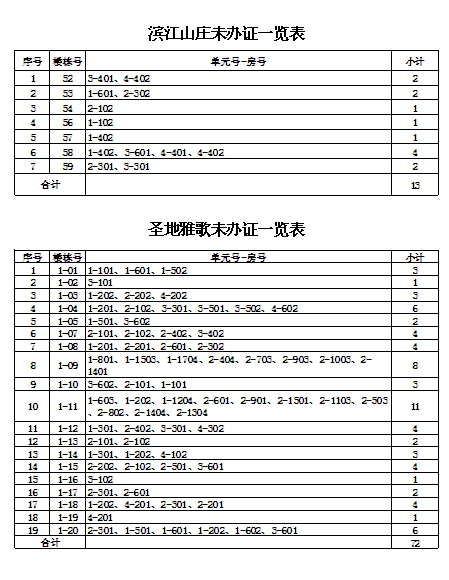 由原益安公司和市建投公司負責拆遷和安置的安置戶,安置房辦證工作開展已經(jīng)近三年了。截止目前,還有少部分樓棟號的安置戶(具體樓棟號詳見附表)至今未來辦理辦證手續(xù)。請你們于12月31日前,來我公司辦理相關的辦證手續(xù)。若因安置戶自身原因拖延未辦理各項辦證手續(xù)的,今后由此產(chǎn)生的辦證不便和麻煩,由各安置戶自行承擔。如有疑問或不清楚的請咨詢我公司,咨詢電話:5992137,5992136。
